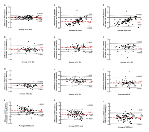 The Colombo IOL (Moptim, Shenzhen, China) is an emerging instrument that employs SD-OCT technology for the measurement of ocular biological parameters, including AL, central corneal thickness (CCT), anterior chamber depth (ACD), lens thickness (LT), keratometry (K), white-to-white (WTW) distance, and pupil diameter (PD). The assessment of these indicators bears significant clinical implications. For instance, AL, CCT, K1, and K2 can be utilized to identify biomarkers associated with conditions such as keratoconus and pathological fundus changes associated with high myopia6. Currently, the available instruments for obtaining these data also encompass Swept Source OCT (IOLMaster 700, Carl Zeiss Meditec, Germany) or OLCR Biometer (SW9000, Suoer, Tianjin, China).
